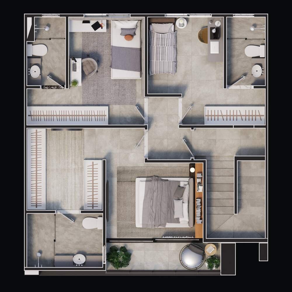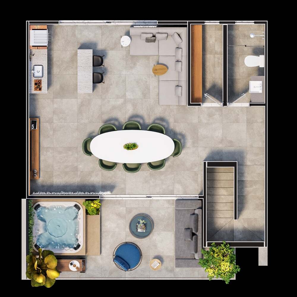 Descrição Rooftop 217,57m²:Térreo com sala de estar e jantar, cozinha, lavabo, área de serviço e garden, 02 vagas de garagem cobertas. No pavimento superior hall de circulação e 03 suítes, sendo uma máster com closet e varanda. No pavimento rooftop, localiza-se área gourmet coberta com terraço descoberto, bem como