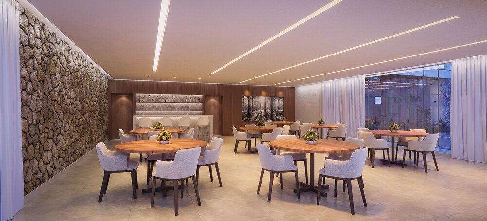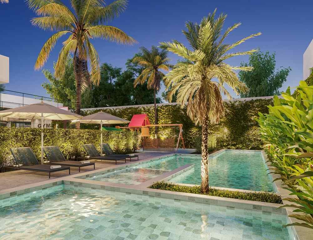 Área de lazer com salão de festas, academia, quadra de esportes, play kids, piscina adulto com raia, piscina infantil, deck solarium, churrasqueira, pet place e praça.